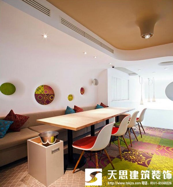 采用鮮艷明亮的簡約風格餐廳裝修效果圖,我們也隨之回到了現代,彩色地板與彩色桌椅相互呼應,個性鮮艷,讓整個餐飲空間充滿著活躍之感,被更為細致的刻畫并且賦予時尚的裝修設計造型與鮮艷的顏色。薄薄的桌面纖細在桌腳,現代工藝使木頭也有不小的改變。